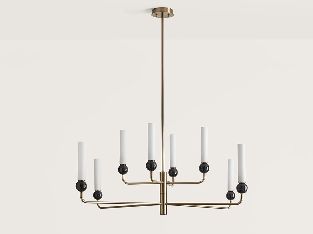 Люстра Delie 8L испанского бренда Aromas Del Campo — современная интерпретация свечи для вашего интерьера. Люстра Delie 8L — это потрясающий источник света, который может стать акцентом современного и стильного интерьера. Абажуры, словно свечи, симметрично расставлены относительно друг друга, а ниже установлен декор - шары из мрамора. Вместе с утонченной стальной структурой плафоны создают великолепный вид, который от потока света будет просто безупречным! Конструкция люстры двухъярусная, окрашена в черный матовый или матовый золотой цвет. Абажуры изготовлены из матового белого стекла. Под каждым абажуром находится декоративный шар из белого либо черного мрамора (в зависимости от отделки металла). В коллекции Delie вы так же найдёте бра.