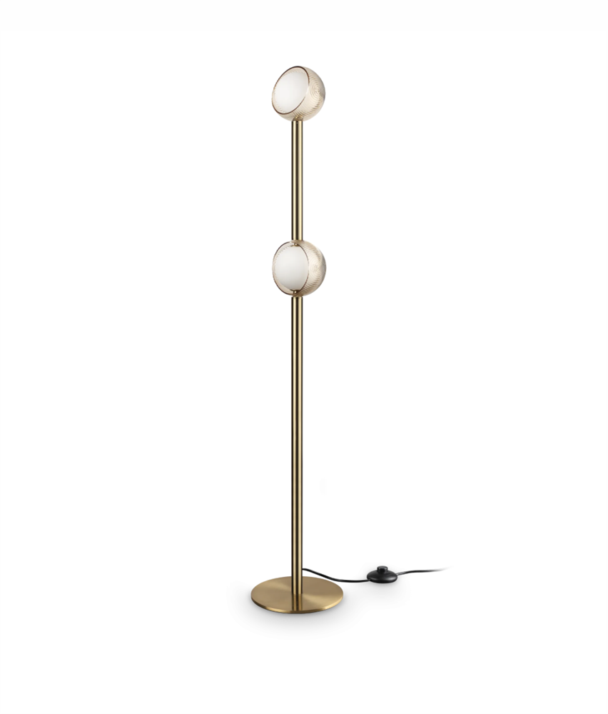 Металлический каркас напольного светильника Ideal lux Bloom с покрытием латунь или чёрным. Рассеиватель из белого матового стекла. Цвета: черная рифлёная арматура с серым матовым внешним стеклом, арматура из полированной латуни с внешним рифлёным янтарным стеклом.