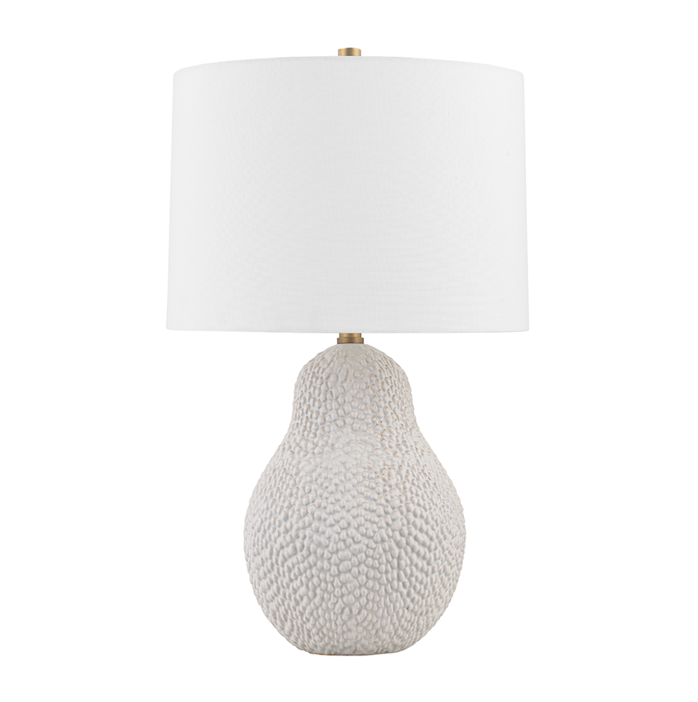 Настольная лампа, Troy Lighting Crater, вдохновлённая формой и внешним видом джекфрута, своим плавным силуэтом и изысканной текстурой создаст тёплую, естественную атмосферу за любым столом. Свет от белого льняного абажура подчёркивает золотистые блики на керамическом основании из белого золота.