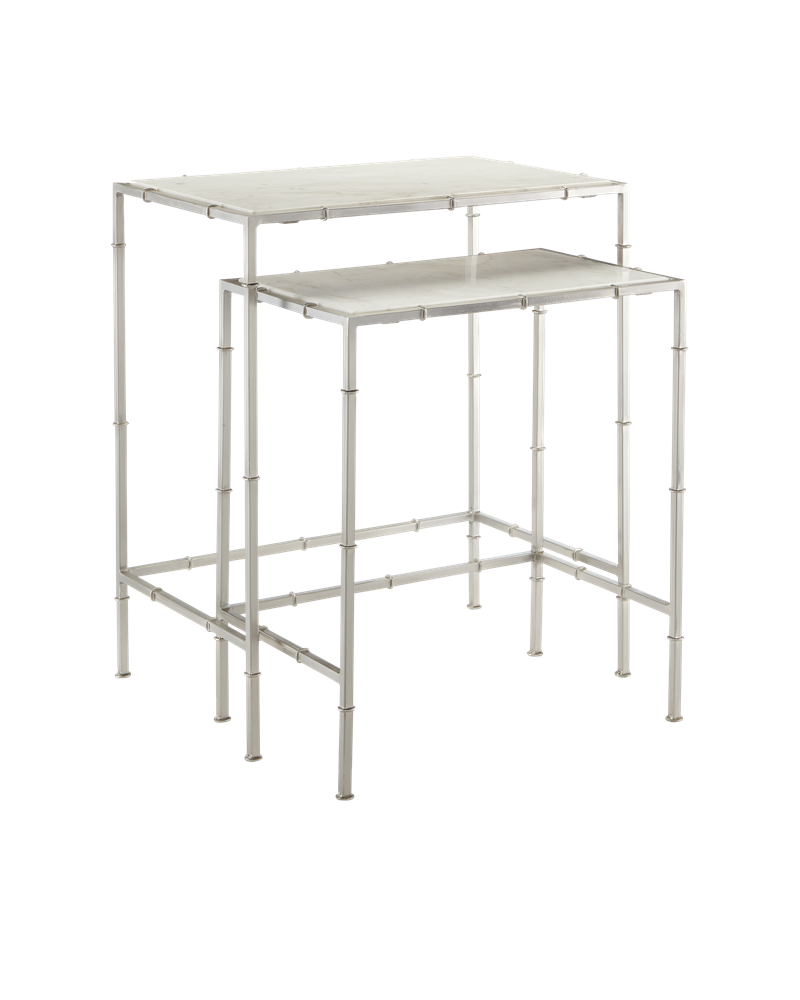 Если идея вложенных друг в друга столов вызывает у вас ассоциации с массивной деревянной мебелью, вас ждёт сюрприз от набора Harte Accent Table Set of 2 американского производителя Currey & Co. Дизайн этой пары серебряных журнальных столиков лёгкий и воздушный благодаря тонким линиям и сияющей никелевой отделке. Столы изготовлены из железа и украшены тонкими выступающими акцентами вдоль каркасов, в которые вставлены столешницы из белого мрамора, завершающие чёткую композицию.
